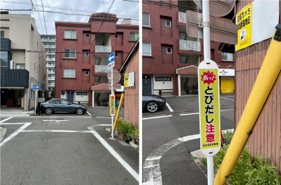 地域の皆さんと現地に赴き、警察と共に対応を検討しました。その結果、「飛び出し注意」の警告看板を設置することに決定しました。